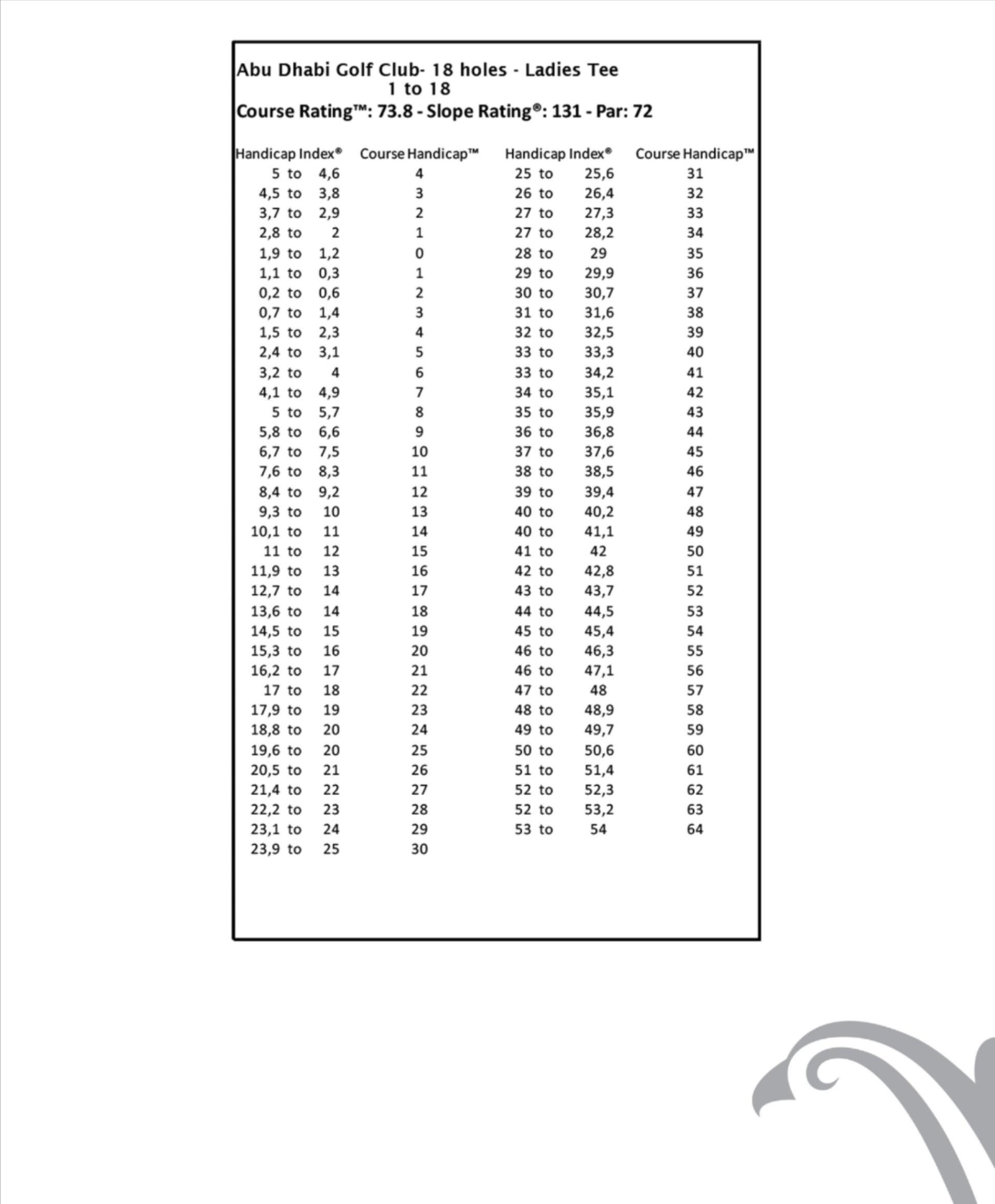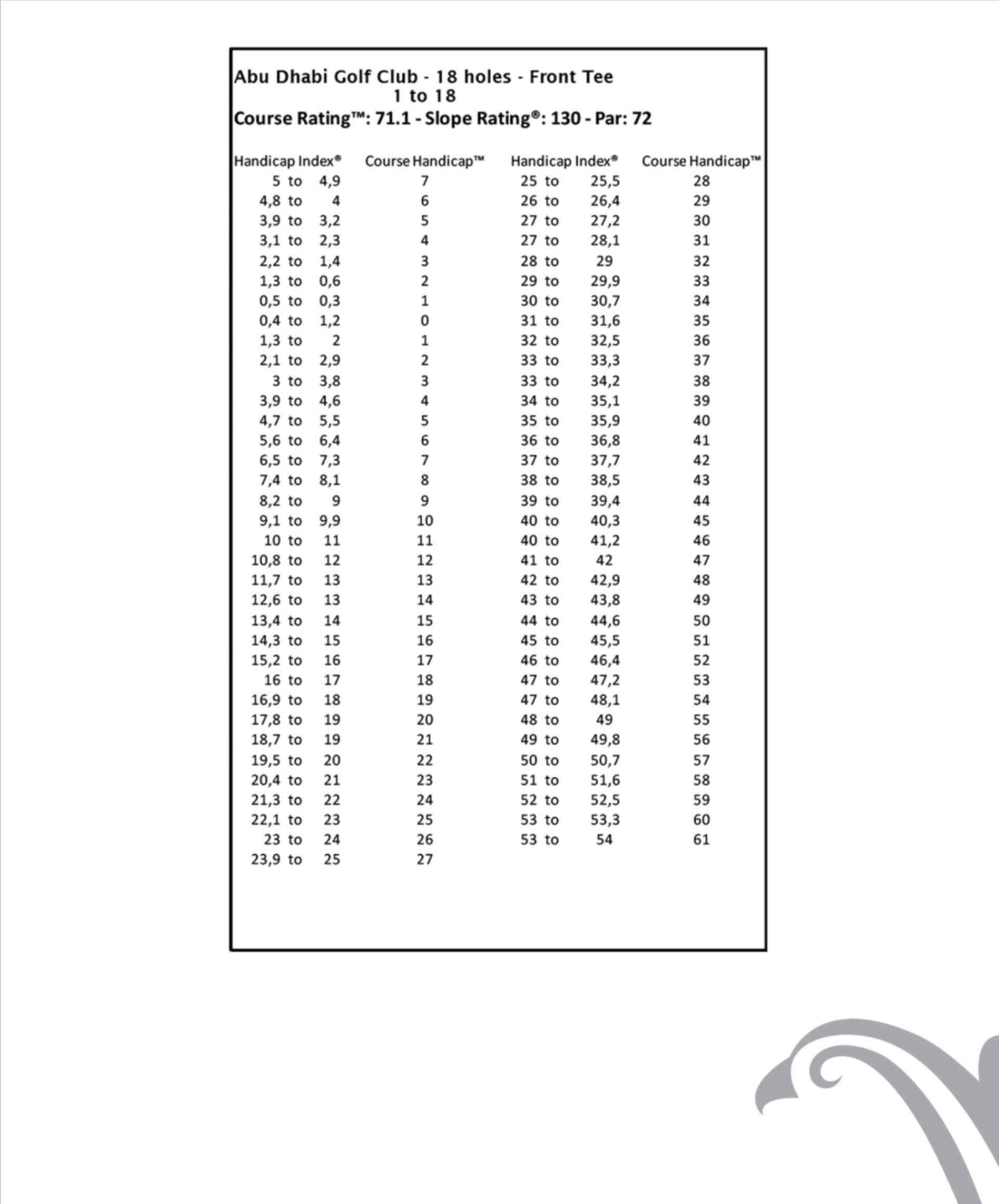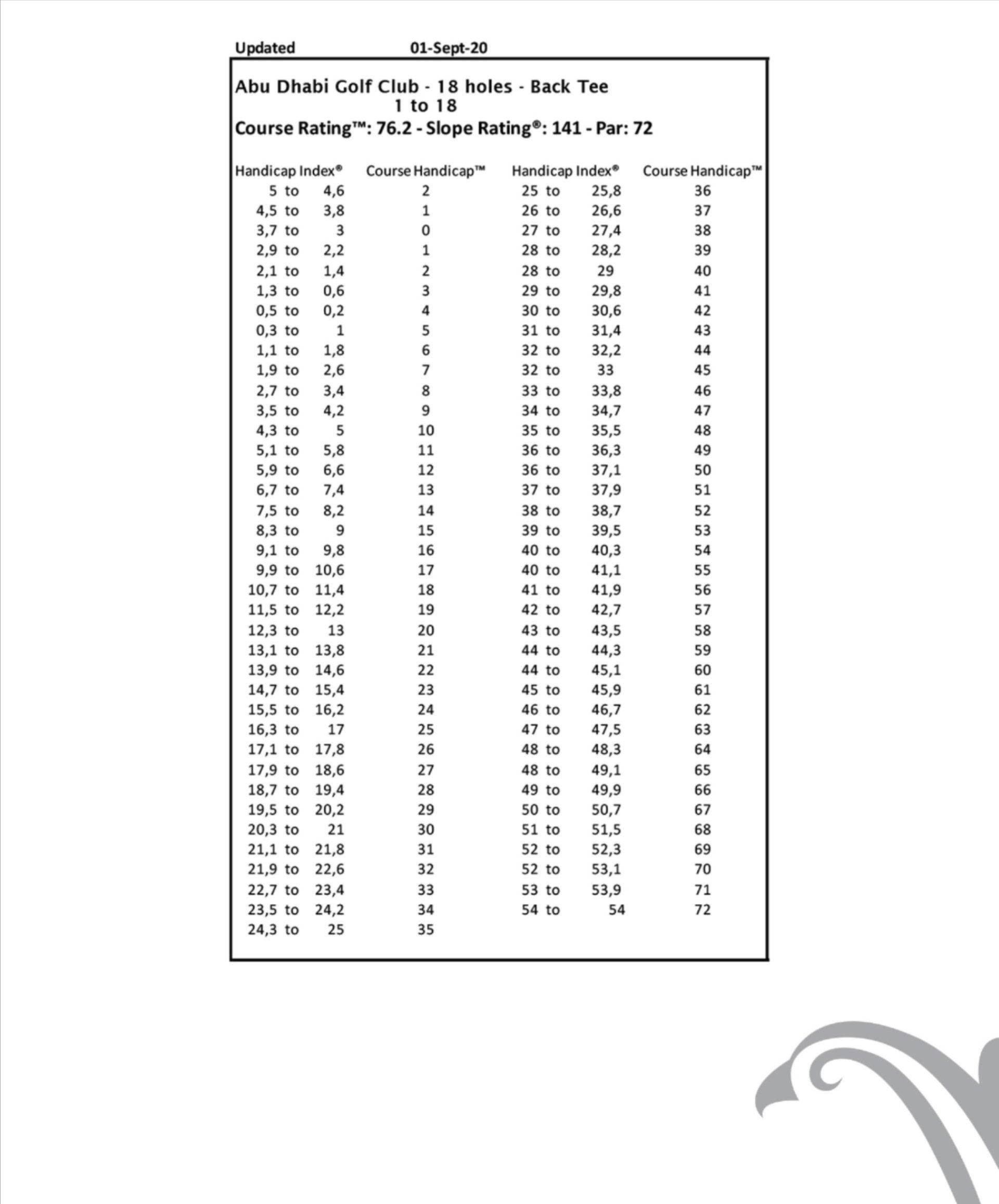 Abu Dhabi Golf Club - Handicap Conversion Table